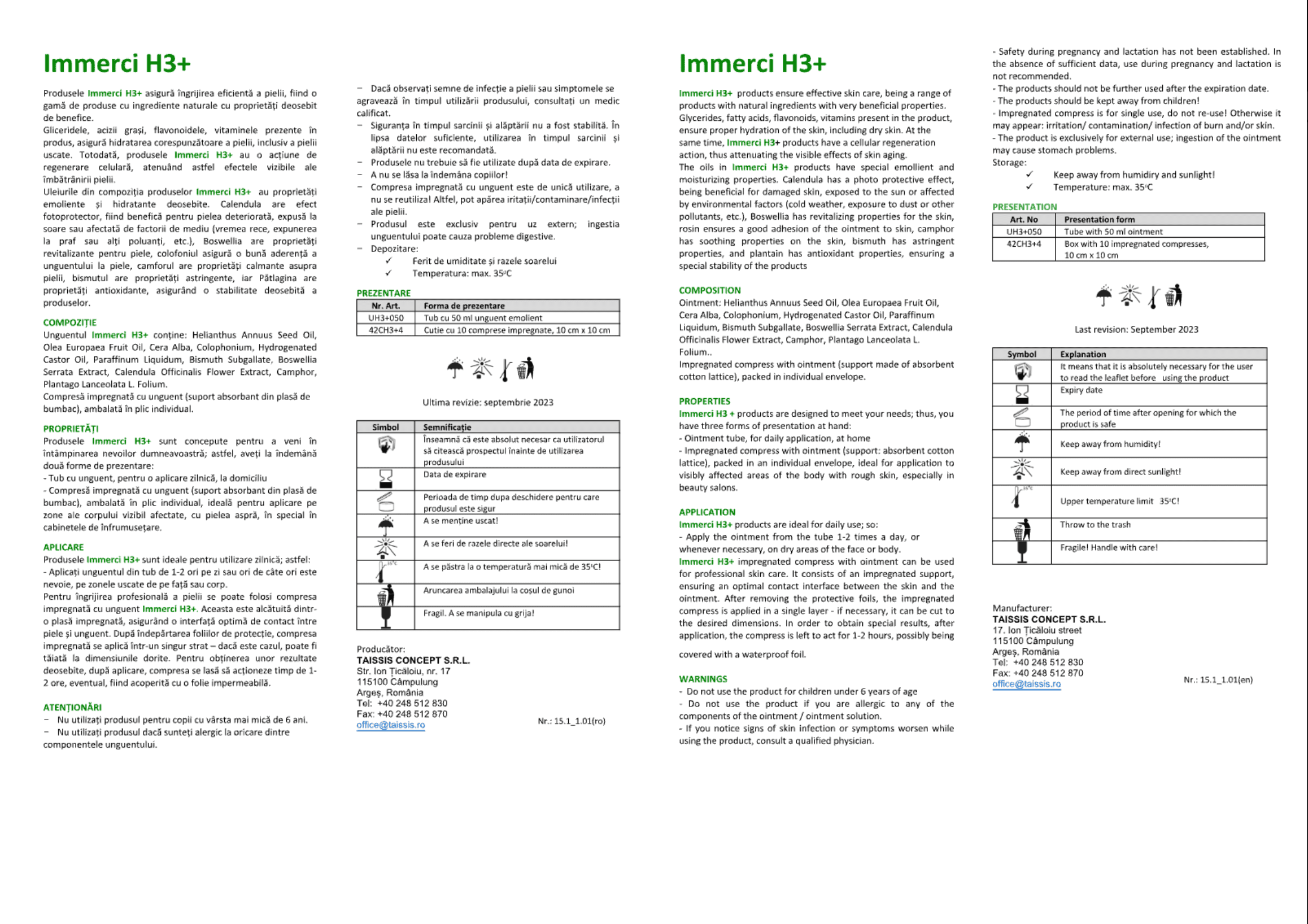 Uleiurile din compozitia umguentului Immerci H3+ au proprietati emoliente si hidratante deosebite. Calendula are efect fotoprotector, fiind benefica pentru pielea deteriorata, expusa la soare sau afectata de factorii de mediu (vremea rece, expunerea la praf sau alti poluanti, etc.), Boswellia are proprietati revitalizante pentru piele, colofoniul asigura o buna aderenta a unguentului la piele, camforul are proprietati calmante asupra pielii, bismutul are proprietati astringente, iar Patlagina are proprietati antioxidante, asigurand o stabilitate deosebita a produselor.
